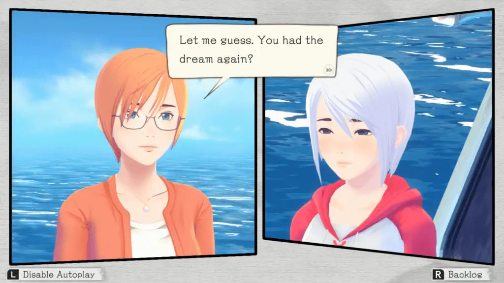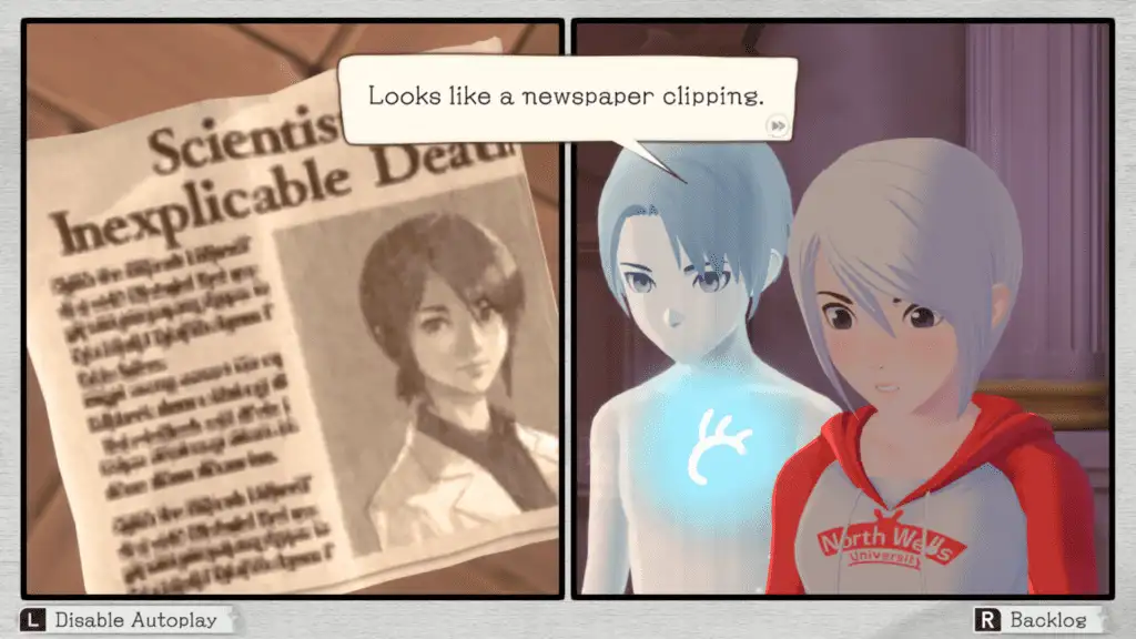 Além de mostrar o objetivo, ele também serve como registro do perfil daquilo que Ashley sabe ou pensa sobre cada personagem conhecido, incluindo árvore genealógica e linhas de relações entre as pessoas. Outra melhoria foi a adição do log de conversas, assim o jogador relê o que passou caso ache que perdeu algum detalhe. Até chegar ao fim, o arco de Two Memories dura cerca de umas sete horas muito tensas e atentas.