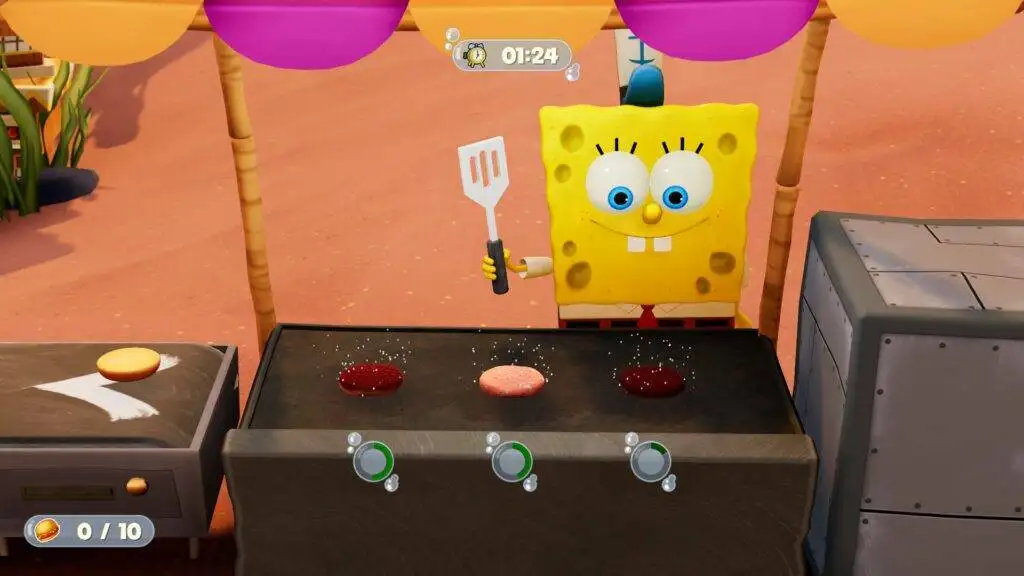 A água, ironicamente, é mortal para o Bob Esponja. E o nosso companheiro Patrick de vez em quando nos leva vidas extras para compensar os danos em batalha… mas deixa as vidas extras diretamente na água, onde é impossível do Bob Esponja alcançar. E deixa em pontas de precipícios e outros locais mortais para o próprio melhor amigo coletar. Patrick é um fã ou hater, ou apenas um companheiro com problemas de inteligência artificial?